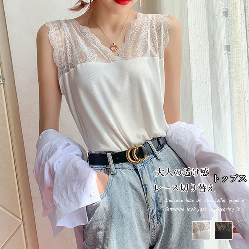 レースデザインノースリーブ トップス タンクトップ Vネック インナー キャミソール 肌着 レイヤード 透け感
