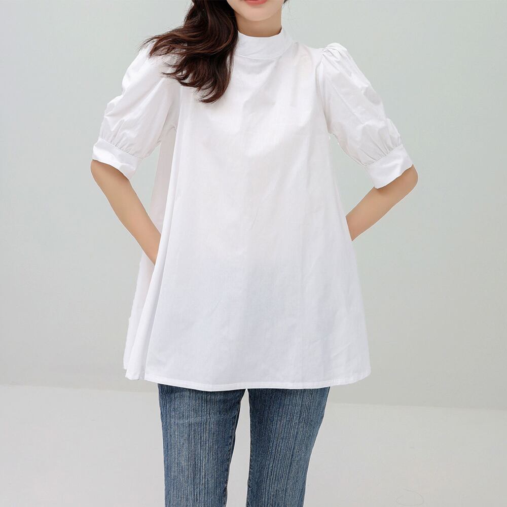 たっぷりとタックを入れたパフ袖は大人フェミニンと程よく肩の力が抜けたリラックス感、半袖より少し長めの5分袖の丈感によって気になる二の腕がさりげなくカバーされて嬉しい