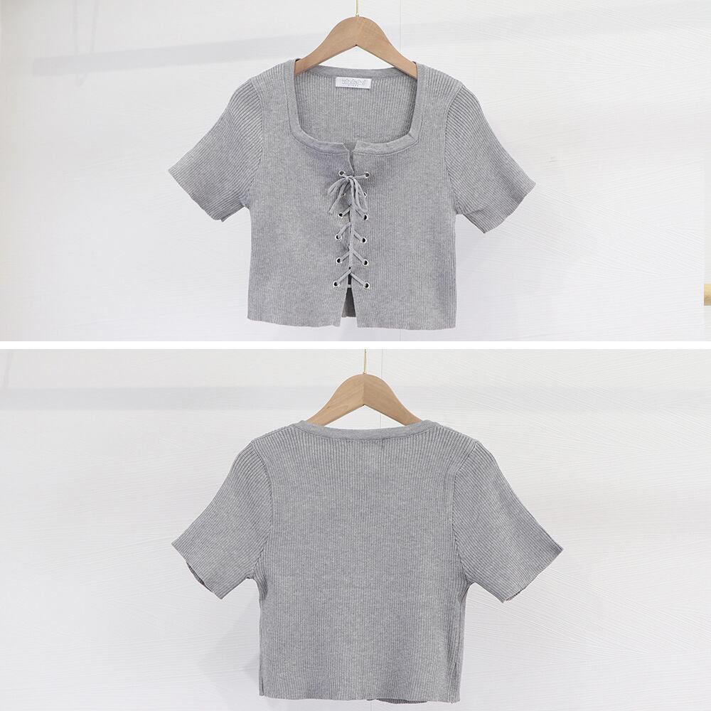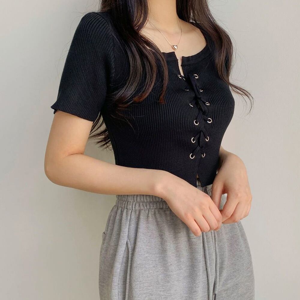 へそ出し サマーニット ショート丈 ニットトップス 肌見せ 夏 トップス レースアップ 半袖クロップド丈