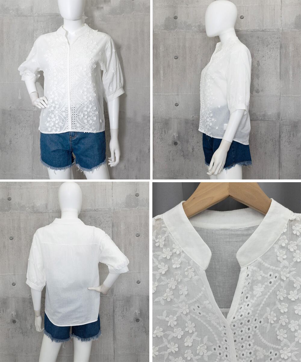 半袖 レースブラウス 花柄 シャツ トップス キーネック 刺繍 トップス ホワイト