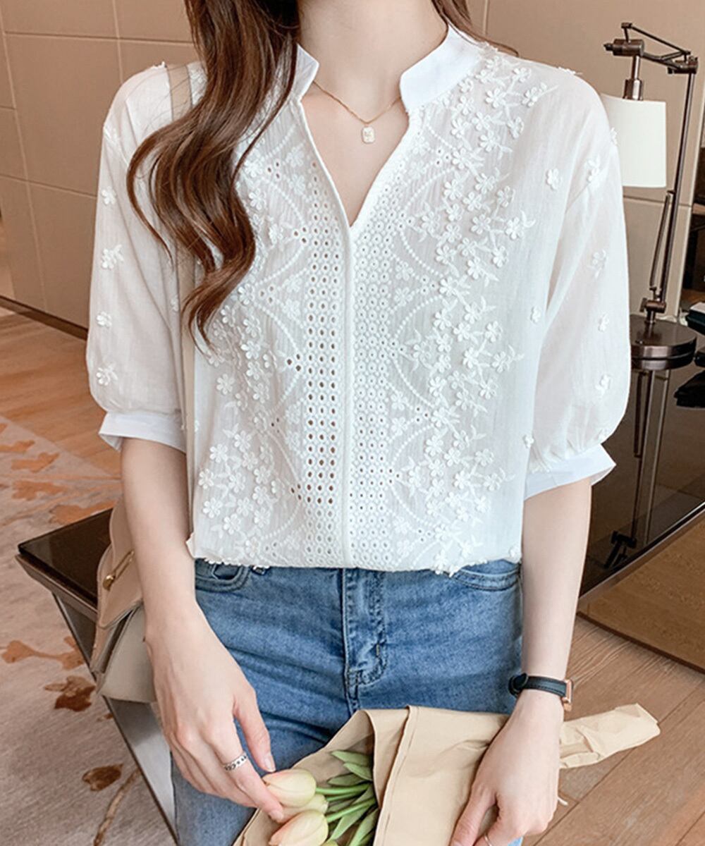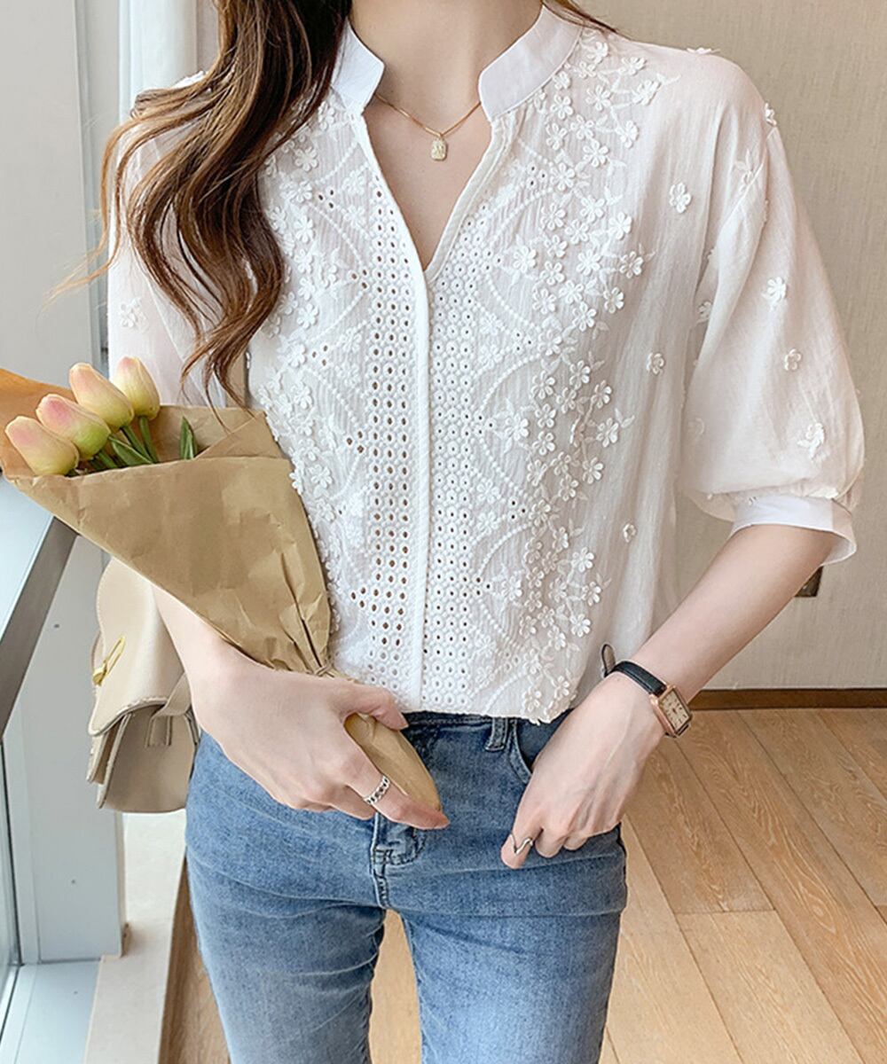 キーネックデザインでデコルテをキレイに見せてくれる花柄刺しゅうブラウス