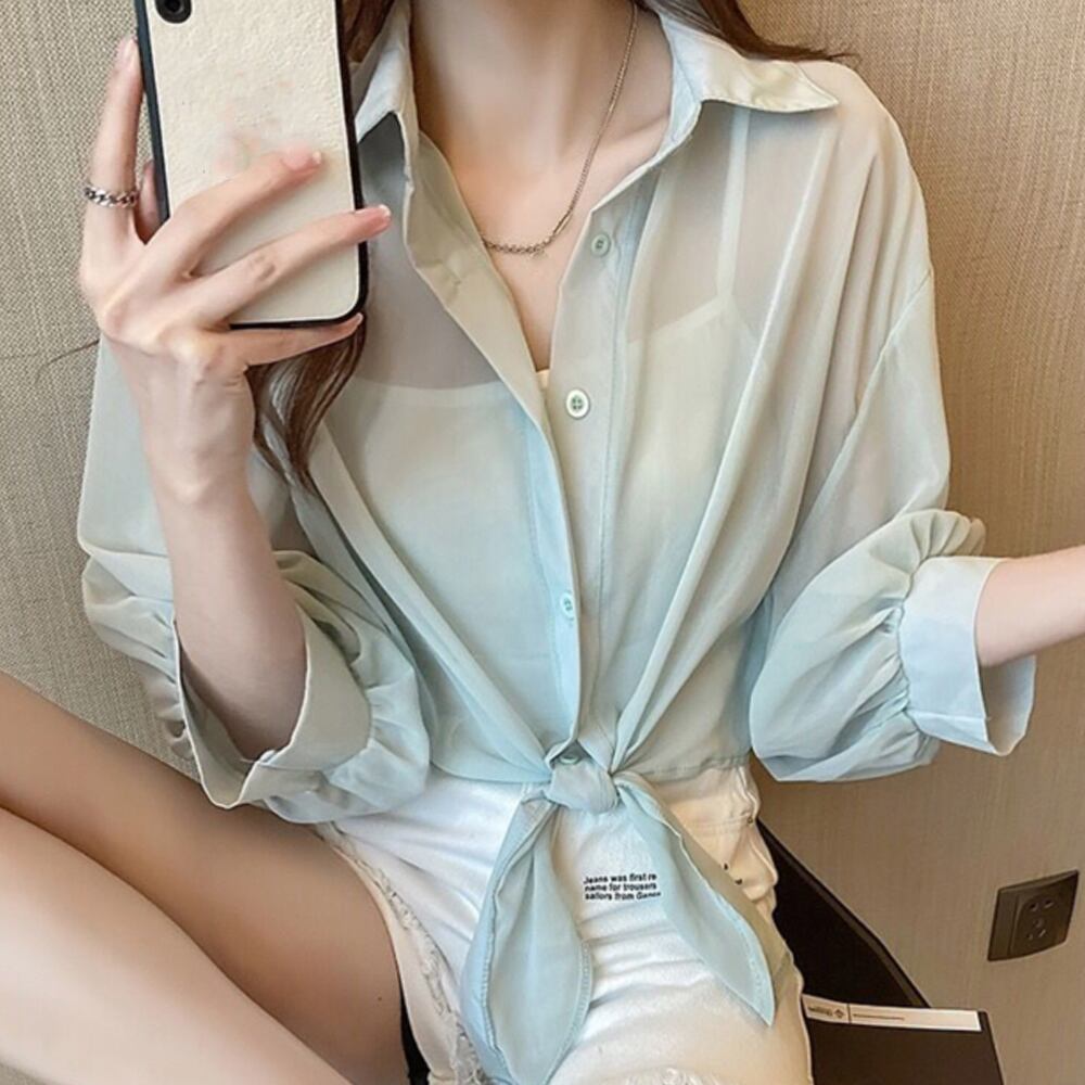 裾リボン結び シャツブラウス UV対策 日焼け防止 シアーカーディガン レディース 透け感 薄手 羽織り