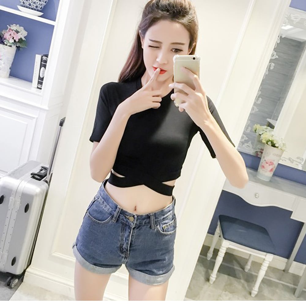 へそ出し トップス レディース 半袖 Tシャツ 無地 カットソー ショート丈