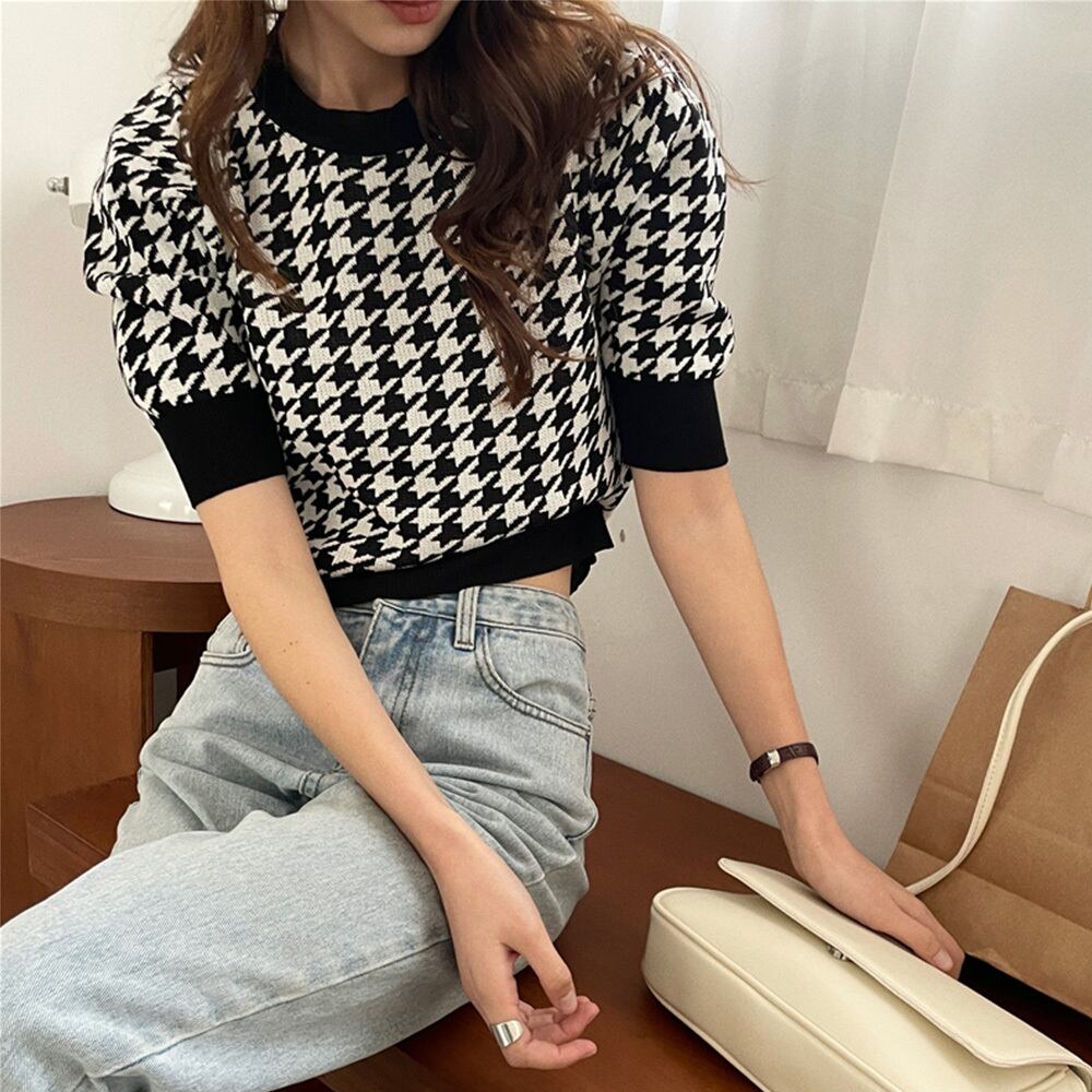 千鳥柄サマーニット レディース夏服半袖 パフスリーブ ラウンドネック ニットトップス 千鳥格子柄 韓国プルオーバー